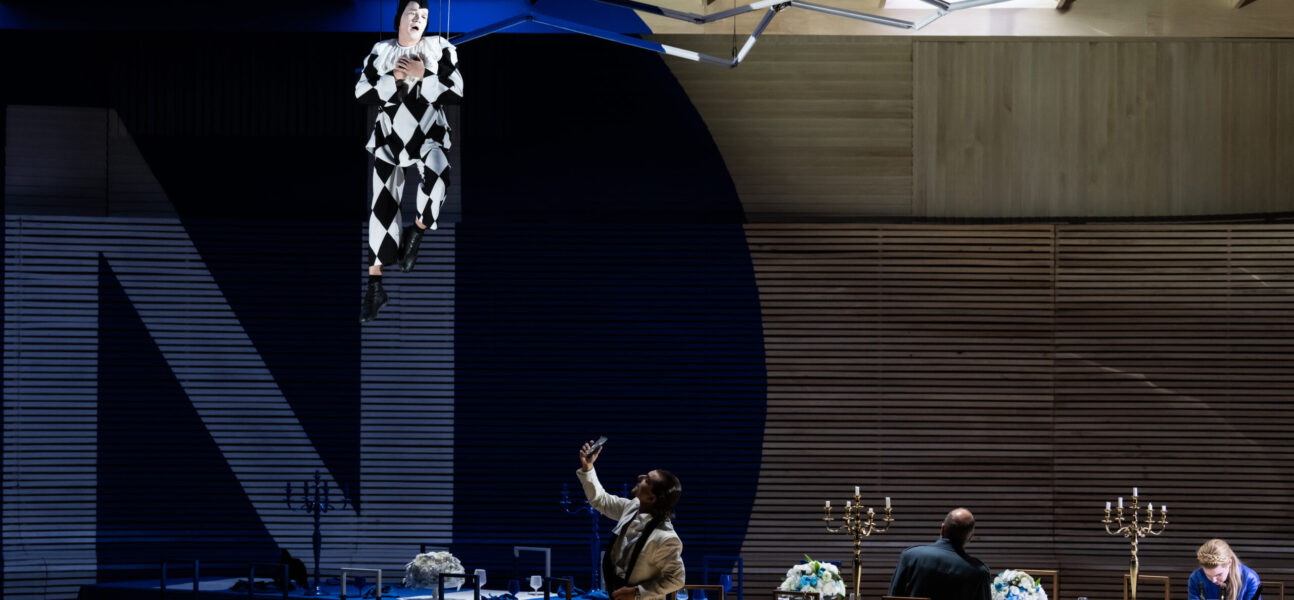 Le Majordome de Fabien Leriche est antipathique à souhait, très classe et parfaitement hautain, même si son allemand ne sonne pas très natif. Excellent Maître de Danse de Grégoire Mour : la voix est flexible et séduisante, et le personnage scénique, nonchalant, très convaincant. William Dazeley est tout aussi bien distribué en Maître de Musique dépassé par les événements. La Prima Donna et le Ténor ont peu à chanter si ce n’est quelques vociférations, mais Sally Matthews et John Findon y sont excellents, sur scène comme sur écran où leur jeu se fait très convaincant, alors que les vidéos en gros plan peuvent être parfois préjudiciables aux chanteurs lyriques. Elle parvient ainsi à être touchante malgré sa rigidité publique, tandis que lui est remarquable de drôlerie. La Zerbinette de Caroline Wettergreen est assez transparente dans cet acte, privant la scène d’une bonne partie de l’énergie comique qu’elle devrait amener. Enfin, Paula Murrihy commence un peu à froid, avec une voix qui manque de rayonnement et d’impact malgré l’intensité de son engagement et de son allemand. Cela s’améliore nettement par la suite, jusqu’à un « Seien wir wieder gut » très réussi vocalement et investi, qui rend d’autant plus frustrant cette fin de prologue qu’on avait l’impression que la sauce prenait enfin sur scène.