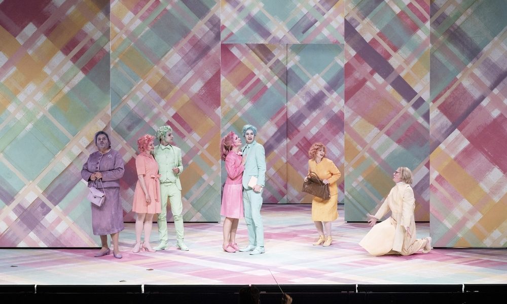 En effet, pour sa mise en scène, Julien Chavaz a bien compris qu’il serait aberrant de monter cet opéra comme on donne encore souvent la pièce d’Oscar Wilde : dans des décors et costumes tout à fait réalistes, et avec un style de jeu non moins réaliste. Dès le lever du rideau, le spectateur est plongé dans un univers improbable, dont rien ne cherche à nous persuader de l’existence. De larges bandes de tissu écossais susceptibles de bouger en tous sens forment la scénoraphie, où à peine un meuble ou deux apportent un semblant d’ancrage dans le réel. Les tenues des personnages renvoient vaguement aux années 1960, mais les perruques de couleur pastel et les maquillages de la même teinte achèvent de déréaliser le tout. Surtout, la gestuelle adoptée par tous se calque sur la musique, avec des moments tout à fait irrésistibles (on pense notamment à ces passages où le manuel d’allemand de Gwendolen semble transmettre un courant électrique à haute tension). Sans jamais être redondants, ces mouvements soulignent au contraire tout le potentiel comique de la musique, pour un résultat ô combien jubilatoire.
