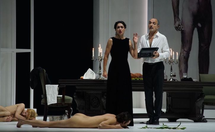 On l’avait constaté avec la production du Barbier de Séville movidesque et kaléidoscopique de Montpellier ; on le lisait plus ou moins noir sur blanc dans l’interview qu’il nous avait accordée à cette occassion : Rafael R. Villalobos construit ses mises en scène par le truchement de références, par l’intertexte. Une telle démarche, dont un Krzysztof Warlikowski est la figure de proue, offre des angles forts pour creuser ou relire les œuvres en même temps qu’elle tend un certain nombre d’écueils sur lesquels un spectacle peut aller s’éparpiller. Aussi, établir un parallèle entre Pasolini, Salo et le drame de Tosca fonctionne « sur le papier ». Pasolini, l’incroyant dont la foi a été brisée par l’expérience du Mal et Salo où la cruauté humaine trouve son paroxysme entrent en résonance immédiate avec le destin de Tosca, qui va jusqu’à défier sa foi en se suicidant, et Scarpia, dont le sadisme immodéré le conduit jusqu’à sa propre mort. Et de fait, de vrais moments de justesse théâtrale parsèment la proposition du metteur en scène sévillan : le meurtre ritualisé en scéance digne d’un donjon BDSM ou Tosca qui a compris que Mario est mort sitôt la balle tirée et qui vit la dernière scène comme un déni, par exemple. Là où le spectacle s’enlise, c’est que ces références pertinentes sont appuyées, démontrées, sans cesse rappelées : un pas de deux entre Pasolini et son jeune amant au son de I found my love in Portofino avant le début du deuxième acte et un récit wikipédia projeté sur un rideau de scène (Judith décapitant Holopherne conçu par le peintre Santiago Ydañez d’après Caravage, une référence supplémentaire qui arrive sans cohérence avec tout le reste) racontant la dernière soirée de Pasolini avant son assassinat. Si bien que cette deuxième narration finit par prendre le pas sur celle de Tosca et vide le drame de Puccini de sa substance et de son théâtre propre. Myrto Papatanasiu est en roue libre et semble plus préoccupée de son jeu de jambes dans sa magnifique robe fendue, Pavel Cernoch reste les bras ballants… seul Laurent Naouri incarne un Scarpia nerveux, impatient et roué. Si l’on ajoute le décor unique sur tournette – elle aussi Janus scénographique qui offre autant de possibilités astucieuses que de tours de manège inutiles – les figurants surnuméraires (quand les chœurs sont privés de scène, covid oblige) on se retrouve avec une somme riche d’idées mais pêchant sur la direction d’acteur et rapidement vidée de tension dramatique.