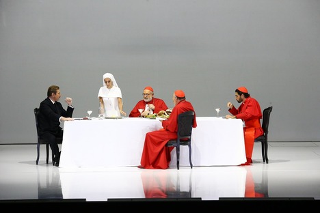 Cela, c’est la Tosca du livret mis en musique par Puccini. Ce que nous avons vu, c’est l’interprétation de Silvia Paoli. Elle semble s’être attachée à démontrer que Tosca est une œuvre politique à visée anticléricale, voire antireligieuse. En surlignant la dévotion affichée de Scarpia, qui devient une démonstration histrionique, elle allie la religion, même dévoyée, à la cruauté fondamentale du personnage. Et la religion est contaminée par l’hypocrisie de ceux qui s’en réclament, parlent de vertu et dissimulent ainsi leurs comportements vicieux. Le même Scarpia qui se prostre au pied de la Crucifixion reconstituée en tableau vivant – une évidente imposture – demandera plus tard à la jeune novice qui fait partie de son service de lui montrer son sexe afin de s’exciter avant de se masturber. Il tentera de violer Tosca en la plaquant sur la table dans une position qui n’exclut pas la sodomie. Ses commensaux sont des cardinaux – si l’habit fait le moine – dont Sciarrone, ce qui compromet encore davantage l’Eglise, qui de témoin devient agent du pouvoir répressif. Et celui assis de trois-quarts derrière la table, quel service recevait-il de la novice qui se lève d’entre ses genoux ? il reviendra prendre de la nourriture après avoir quitté la table, joignant la gourmandise à la luxure.