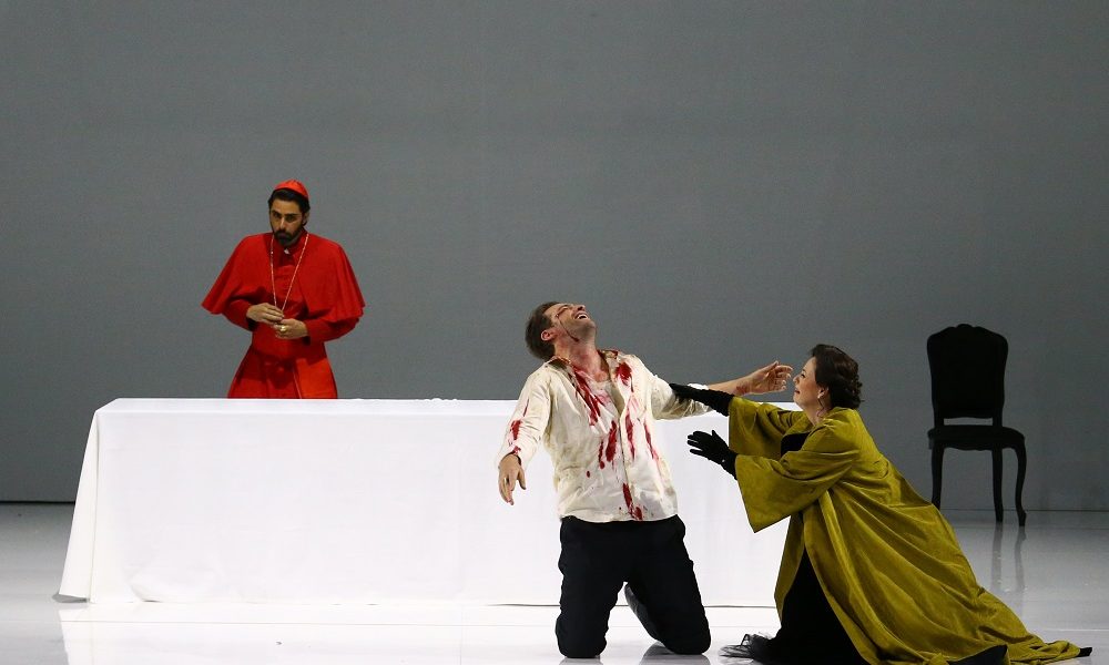 Ce ménage dans la « tradition » – ce qu’on appelle ainsi se conforme, faut-il le répéter, aux volontés des auteurs – se poursuit avec la ruée des sbires de Scarpia qui dépouillent son cadavre à l’exception d’un sous-vêtement. Les mêmes étaient à l’œuvre pour fouiller l’église, l’échafaudage élevé pour Cavaradossi devenant pour ces « ninja » prétexte à diverses acrobaties répétitives. Et ils sont probablement les mêmes à avoir défilé jusqu’à former un groupe qui ploie et s’effondre sur la terrasse, au dernier acte, avant de laisser la place à l’ossuaire mentionné ci-dessus. Si la forme de leurs interventions ne nous a ni passionné ni semblé utile, ils s’en sont acquittés vaillamment.