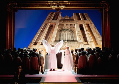 Dans cette récente production de Lohengrin au Deutsche Oper, avec Waltraud Meier à l’affiche afin de contribuer superbement au panache des célébrations du bicentenaire de la naissance du compositeur, la mise en scène de Kaspar Holten, à vouloir être trop consensuelle, est plate et insipide. Elle se borne à créer un climat inquiétant, notamment par des éclairages brusques ou aveuglants, plutôt que de se charger de signifiant. Les décors tantôt décalés, tantôt inutilement sophistiqués de Steffen Aarfing ne s’accordent pas vraiment avec son choix des costumes militaires toutes époques pour le chœur qui vise, semble-t-il, à transcender la temporalité de l’épopée à travers les âges. C’est ainsi que Lohengrin, interprété par Michael Weinius dans cette reprise, se retrouve boudiné dans une robe de bure et affublé d’ailes d’ange qui le font ressembler plus à une drag-queen échappée d’une gay-pride (le maquillage en moins) qu’à un moine-chevalier du moyen-âge. Heureusement son chant éthéré, souvent en demi-teinte comme il se doit, confère au personnage une aura divine qui nous fait oublier le ridicule de son accoutrement et ses déplacements patauds au milieu d’un chœur trop souvent figé en groupes parfaitement symétriques. Pour la mise en espace d’une chorale on aurait difficilement fait mieux !