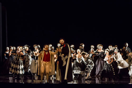 Créée en 2007 puis reprise en 2009, la production du Bal masqué de Verdi signée Gilbert Deflo a plutôt bien vieilli, à moins que par comparaison avec certains spectacles récents, ce qui nous avait semblé discutable à l’époque, paraît aujourd’hui bien dérisoire à commencer par l’atmosphère uniformément lugubre dans laquelle se déroule la totalité de l’action. Décors et costumes sont majoritairement noirs, un noir rehaussé par quelques éléments d’un blanc immaculé, l’hémicycle du premier acte surmonté en son centre d’un aigle aux ailes déployées, la statue de Riccado qui trône dans le salon de Renato au troisième acte ou certains déguisements des danseurs dans la scène du bal qui, avec ses lumières tamisées évoque une veillée funèbre. Dans cette production, la seule tache de couleur est la robe rouge d’Ulrica dont l’antre constitue le tableau le plus réussi.