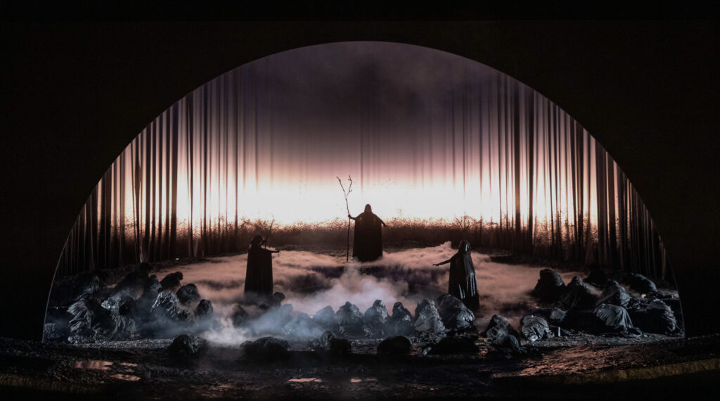 La production de Chiara Muti est d’une grande finesse, à la fois belle et intelligente. Comme l’exposait la metteur en scène dans le dernier épisode de Dans la loge de…, Macbeth est d’abord victime de sa conscience, une fois son premier méfait commis. À un moment, un iris gigantesque viendra d’ailleurs accentuer cette référence à Caïn. Alors qu’on fait souvent de Macbeth un être veule, elle nous montre un personnage rongé par le doute, capable toutefois de se ressaisir, victime d’hallucinations : ces clignements d’yeux réguliers laissent penser qu’il cherche à dissocier le réel du fantastique dans le monde tel qu’il le perçoit désormais depuis son crime. Lors de la seconde apparition des sorcières, il est manipulé comme une véritable marionnette puis se retrouve dépossédé de lui-même, apparaissant comme un simple histrion sur une scène de fortune (dont les feux se révèleront être des lampes manipulées par des démons), avant de se réveiller sur son trône. Il accepte bravement son sort fatal : il jette son épée et écarte les bras pour accueillir le coup de Macduff. D’autre part, le couple maléfique n’est pas ici animé que par le seul intérêt commun de la conquête du pouvoir : la sensualité qui les soude est également exposée. Sans rentrer plus avant dans les détails, l’ensemble des rôles sont ainsi finement travaillés et les chanteurs peuvent probablement remercier Chiara Muti pour les progrès accomplis ! La metteur en scène porte également une attention particulière aux chanteurs qui ne chantent pas (si l’on veut bien nous passer cette formule) : en effet, comme au cinéma ou au théâtre, le travail théâtral (et par conséquence l’attention du spectateur) ne porte pas uniquement sur le personnage qui s’exprime mais aussi sur ceux qui l’écoutent, ce qui contribue à l’impression d’aboutissement de la production. L’univers visuel est celui d’un Moyen Âge idéalisé. Le décor d’Alessandro Camera est spectaculaire tout en étant finalement simple : un pan incliné avec un trou enfumé en son centre, sorte de chaudron de sorcière qui déborde, avec des rideaux et accessoires qui viennent préciser les divers lieux de l’action sans pauses inutiles entre les scènes, un théâtre d’ombres. Les costumes d’Ursula Patzak sont variés et splendides. Si les couleurs sombres dominent (Black is the new black), les éclairages de Vincent Longuemare les rehaussent et participent à cette sensation un peu glauque de mystère étouffant. Les adeptes de l’actualisation systématique seront ici légitimement déçus. Toutefois, le succès rencontré par l’avant-première, destinée au jeune public, laisse à penser que celui-ci est davantage fasciné par un univers rappelant Game of Thrones ou The Lord of the Rings que par celui des toilettes de la Gare du Nord. La version donnée est celle de 1874. Le ballet en est heureusement conservé, ce qui offre un triple intérêt. Le premier est d’entendre une excellente musique. Verdi était toujours réticent à l’idée de composer ces pages, mais le cahier des charges de l’Opéra de Paris l’y contraignait. Il faut croire que cette obligation a pu avoir un effet paradoxalement positif car ces ballets (La Peregrina pour Don Carlos, Les quatre saisons pour Les vêpres siciliennes, ceux du Trouvère et d’Othello…) sont musicalement remarquables, largement supérieurs à quelques uns des grands ballets classiques (1). Le deuxième intérêt est de voir ce ballet intelligemment intégré à l’action : ici une inquiétante cérémonie où s’opposent magie noire et magie blanche autour du fils de Duncan, Malcom enfant. Enfin, le ballet permet également d’apprécier à nue la formation turinoise sous la baguette de Riccardo Muti. La chorégraphie de Simone Valastro (issu l’École de danse de la Scala de Milan et ancien membre… du Corps de ballet de l’Opéra de Paris) est efficace et bien exécutée, intelligemment en phase avec la musique (par exemple, Verdi écrit des traits saccadés pour les premiers violons et ceux-ci sont illustrés parallèlement par des secousses de rires des démons). Au global, la soirée une belle réussite.