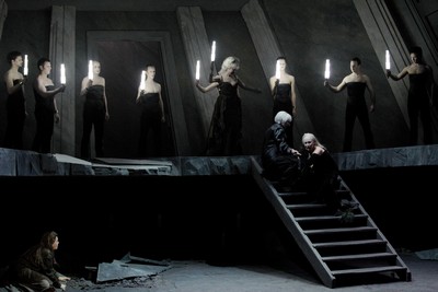 Après Carmen et L’italiana in Algeri le périple méditerranéen proposé par l’Opéra de Marseille pour cette saison se poursuit avec cette production d’Elektra créée in loco en 2003. Dix ans passés n’ont rien enlevé au décor d’Emmanuelle Favre de son élégance froide et de sa fonctionnalité. Le palais d’Agamemnon s’élève si haut que la cour intérieure semble un puits de lumière autour duquel des galeries à angles droits relient les étages. Mais au pied de cet édifice géométrique bée un sous-sol obscur, tout ensemble lieu de réclusion et refuge pour la rebelle, où la nature brute, roches et anfractuosités mêlées, est tapie sous l’ordre apparent. Quelques changements en revanche pour les costumes de Katia Duflot, mais l’esprit reste le même : Elektra refuse les armes de la féminité, Chrysotémis les assume et Clytemnestre les exacerbe, soit par tempérament soit parce qu’elle en redoute la péremption. Les autres sont fonctionnels – les servantes – ou dérivent de leur position – discrétion volontaire pour Oreste, reflet au masculin de Clytemnestre pour Egisthe. En revanche les lumières, signées cette fois par Marc Delamézière, n’ont pas toujours l’efficacité souhaitable, par exemple au crépuscule initial et dans l’éblouissement final.