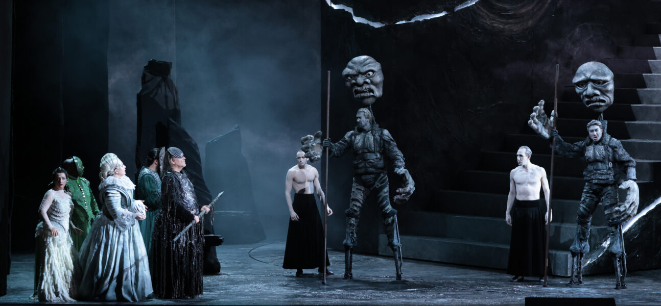Déjà auteur du mise en scène du Ring à Strasbourg il y a plus de 15 ans, David McVicar offre ici une production différente (quoiqu’avec quelques emprunts). Après ce prologue, il est difficile d’imaginer dans quelles directions s’engageront les journées suivantes : en l’état, l’approche nous a semblé plutôt littérale, sans volonté de relecture, même si la scénographie est moderne. Celle-ci est simple et élégante, rappelant parfois la vieille production d’Otto Schenk au Metropolitan de New York, mais malheureusement sans le côté mystérieux de celle-ci en raison d’éclairages bien trop crus. Le fleuve est figuré par des éclairages bleus. Les Filles du Rhin s’ébattent au milieu des débris d’une gigantesque statue. L’or est symbolisé par un danseur à demi nu dont Alberich volera le masque. Le costume de ce dernier semble inspiré des mangas. Le Walhalla est classiquement représenté par un escalier monumental. Les dieux portent eux aussi initialement des masques. Ceux-ci symbolisent la jeunesse éternelle apportée par Freia : les dieux les quittent lorsque la jeune femme est emmenée par les géants. Leurs costumes sont plutôt surprenants. Wotan est vêtu d’une jupe longue noire (déjà vue épousant le fessier de Méphisto dans le Faust londonien du même McVicar). Fricka ressemble à Montserrat Caballé en Maria Stuarda. Froh est le moins gâté avec un masque triple et une robe à panier verte évoquant Louis de Funès dans La Folie des grandeurs (allusion à la construction du Walhalla ?) : à moins que le metteur en scène n’ait voulu insister sur la triple symbolique du dieu du printemps (fertilité, prospérité, paix). Les géants sont montés sur des échasses et assistés de quatre danseurs (ce sont eux qui agissent pratiquement, se saisissant de Freia par exemple). On ne peut qu’être admiratif devant l’aisance vocale des interprètes dans de telles conditions. Loge est lui aussi flanqué de danseurs, postés derrière lui, et sensés figurer les flammes par le mouvement de leurs bras. L’antre d’Alberich comprend un masque doré géant, symbolisant son trésor. Les nains sont joués par des enfants du Chœur de voix blanches de la Scala. La scène de transformation en dragon est particulièrement réussie (celle en crapaud l’est moins) avec l’utilisation d’une marionnette figurant un squelette préhistorique. Erda sortira de dessous l’escalier géant : avec ses longs cheveux blancs qui lui descendent jusqu’aux genoux, elle ressemble au Père Fouras dans Fort Boyard. Comme à Strasbourg, l’or sous lequel Freia se dissimule au regard des géants est une version miniature du masque. Un rideau noir tombe entre chaque scène pour permettre les changements de décors. Au finale, l’escalier du Walhalla se parera des couleurs de l’arc en ciel (comme à New York). Comme toujours avec McVicar, la direction d’acteurs est par ailleurs impeccable. Au global, sa mise en scène s’adresse, plutôt intelligemment, à un public peu familier de l’ouvrage, davantage qu’à un cercle d’initiés comme à Bayreuth. Il sera de plus intéressant de voir comment le propos du metteur en scène évolue dans les ouvrages suivants.