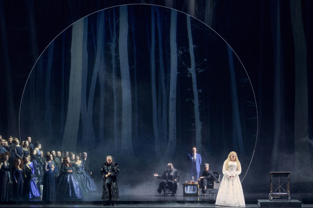 La complexité de la déferlante wagnérienne est maîtrisée et la jeune femme réussit à tirer de la formation équilibre, continuité et excellente qualité d’ensemble ; de son côté, le metteur en scène Johannes Erath a manifestement cherché à ne pas être en reste. Le musicien, assistant entre autres de Willy Decker, qui a par ailleurs grandi dans sa Forêt Noire natale, à la fois enchanteresse et sombre, a choisi de plonger le plateau dans une semi-obscurité, entre chien et loup, dans une ambiance mi féerique, mi naturaliste. Dans la pénombre, nous précise-t-il, difficile de savoir si, en apercevant un animal, il est habité d’intentions pacifiques ou hostiles. Les personnages principaux sont ainsi vêtus de blanc ou de noir, les autres portant des couleurs oscillant entre le bleu nuit, céleste, ciel ou azur, les teintes scintillantes rehaussées de strass étoilés ou de nébuleuses floues selon les éclairages, privilégiant les teintes froides. Entre onirisme et réalité crue, la mise en scène laisse la part belle au texte et à la logique visuelle qui en résulte. Les costumes et accessoires nous installent dans une temporalité élastique, mais on ne peut s’empêcher de penser aux années Trente, même si un écran de télévision nous renvoie une génération plus loin. Les images projetées en fond de scène tout comme celles du téléviseur sont en décalage et nous forcent à choisir ou à louvoyer. Une scène est tout particulièrement frappante et souligne cet écart temporel, cette sensation de flou, de fausseté, voire d’absurdité qui s’en échappe : le chœur trinque et mime le geste de boire, alors que les projections à l’arrière nous le montre, en noir et blanc, bel et bien en train de boire de la bière. Si Lohengrin et Elsa sont blancs comme neige quand Ortrud et Telramund sont en noir corbeau, difficile d’en faire une dichotomie manichéenne : les zones d’ombre subsistent, comme dans cette scène de retrouvailles entre les deux femmes dont les lits sont placés dos à dos, comme en miroir. Chacun y trouvera des clefs de lecture et d’interprétation (ou pas), comme de se demander si les deux héroïnes ne seraient pas les moitiés d’une même entité. Tout est suggestion et références plus ou moins biaisées. On pense souvent à l’Excalibur de Boorman (une épée fichée dans les gradins qu’on vient déloger) ou Melancholia de Lars von Trier (les planètes géantes qui se rapprochent dangereusement), voire à d’autres correspondances cinématographiques, comme Die 1000 Augen des Dr. Mabuse (Le Diabolique Docteur Mabuse) de Fritz Lang ou encore M le Maudit. Mais aucune référence n’est insistante, comme si Johannes Erath se contentait d’instiller le doute et les interprétations possibles en nous laissant construire notre propre exégèse. C’est tout à son honneur. Le résultat est magnifique, notamment pour la beauté des costumes, l’élégance sophistiquée des coiffures et l’ambiance onirique générale. Le décor ressemble par endroits à un œil et son iris, pupille dilatée, véritable ouverture à l’iris sur rétine ultrasensible ou fragilisée jusqu’au décollement.