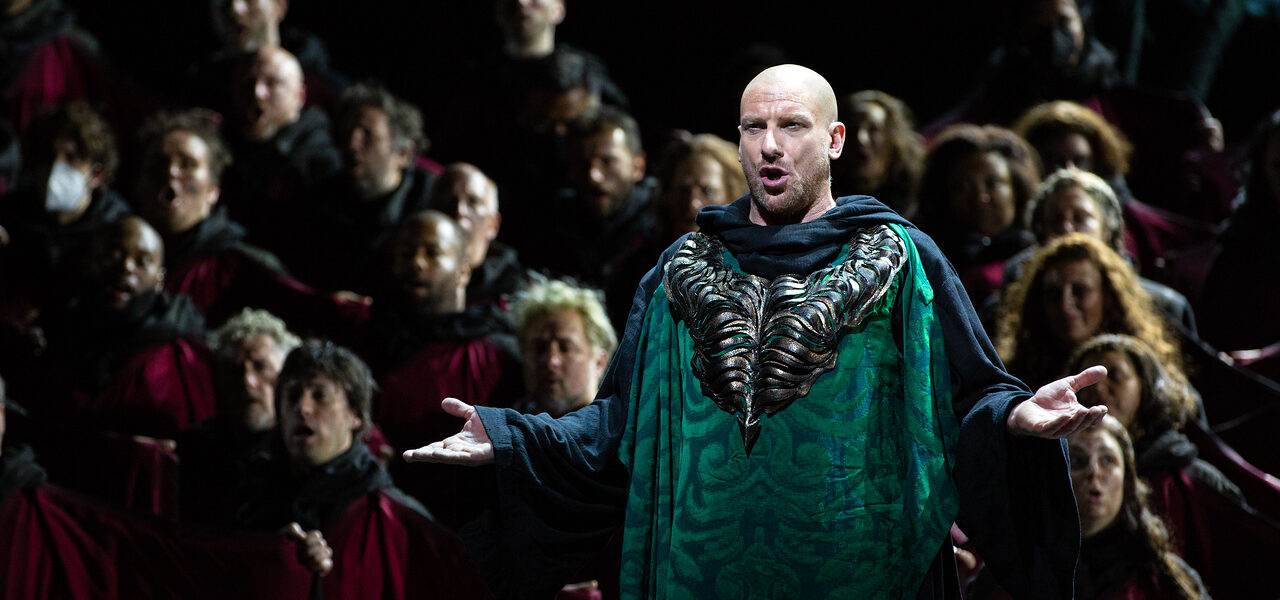 Lohengrin fait son retour sur la scène du Metropolitan Opera après dix-sept ans d’absence, dans une nouvelle production* de François Girard qui avait déjà signé en 2013 un Parsifal mémorable avec Jonas Kaufmann ainsi qu’un Vaisseau fantôme en 2020. Pour sa troisième production in loco le metteur en scène québécois situe l’action dans un univers post-apocalyptique. Les personnages sont enfermés dans un vaste souterrain obscur surplombé par une dalle gigantesque percée d’une large ouverture circulaire qui permet de voir le ciel étoilé, les galaxies et le passage à intervalles réguliers de la lune. Autour, on devine un paysage désert. Au centre de la scène, juste au-dessous de l’ouverture, un escalier grisâtre. Côté cour, un arbre mort dont une souche sert de trône au roi Henri l’Oiseleur. Les décors sont signés Tim Yip, tout comme les costumes d’inspiration médiévale. Les choristes sont vêtus de longues capes noires qui, par un jeu habile d’aimants, s’ouvrent alternativement sur différentes tenues colorées, le vert qui représente le roi, le rouge qui caractérise Ortrud, Telramund et les Brabançons et enfin le blanc, symbole de la pureté d’Elsa et de Lohengrin. Même le chef d’orchestre changera de vêtement d’un acte à l’autre pour être en accord avec ces couleurs. Cependant si l’idée est originale, au bout d’un moment l’ouverture et la fermeture incessante des capes finit par lasser voire provoquer des rires chez les spectateurs lorsqu’un choriste du premier rang se trompe de couleur. La direction d’acteurs est sobre mais précise. L’apparition de Lohengrin dans l’ouverture de la dalle, vêtu d’une chemise blanche et d’un pantalon noir comme les chevaliers du Graal du Parsifal de 2013 crée un lien entre les deux productions. Pas beaucoup d’idées en somme dans ce spectacle qui n’en demeure pas moins efficace, le public ayant en permanence les yeux rivés sur les différents protagonistes qui évoluent sur le devant de la scène.