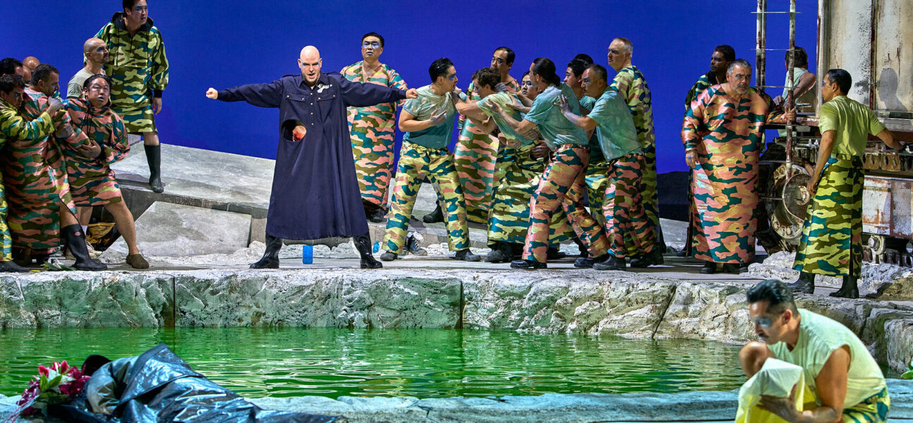 Le dernier acte est un peu plus calme : tandis que Kundry lave les pieds de Parsifal, de l’eau jaillit de rochers suspendus dans les airs. A nos pieds, un renard attend tranquillement dans les neiges. Nous sommes dans une mine de lithium ou de cobalt : sur scène, une excavatrice à godets et, flottant dans les airs, sa réplique gigantesque. Quelques sacs plastiques volent dans tous les sens (c’est un peu énervant). Le sol est jonché de vieilles bouteilles plastiques. La mare d’eau pure du premier acte est totalement polluée. Durant l’Enchantement du Vendredi Saint, des fleurs mais aussi des piles usées et des Kalachnikov flottent dans les airs (1).