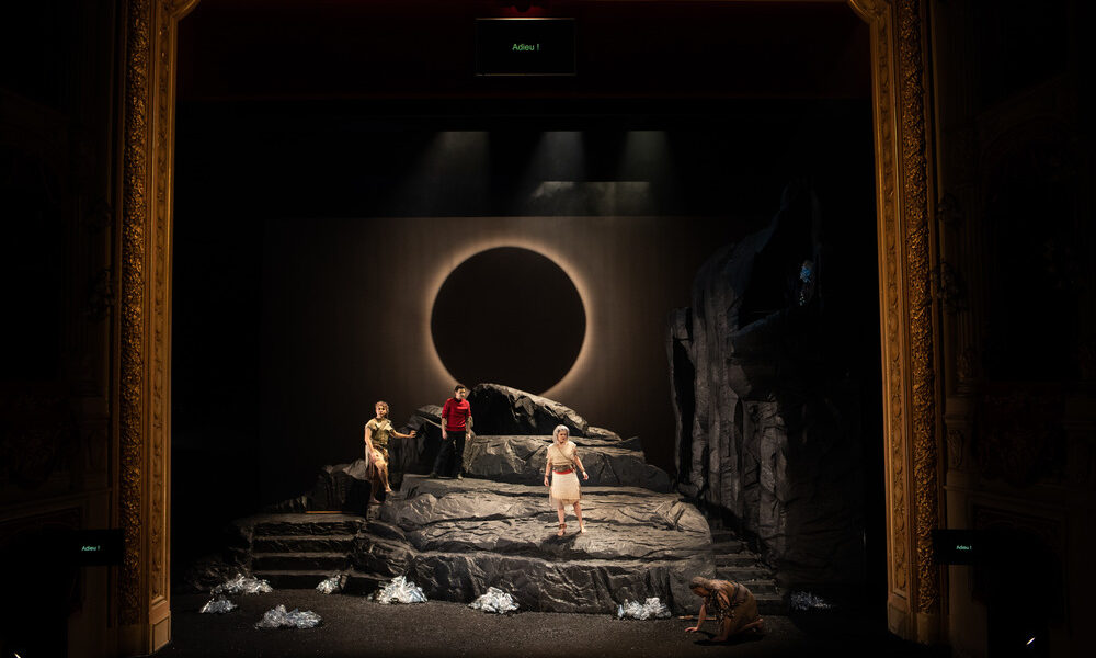Louise Vignaud et Alison Cosson ont choisi d’expurger la turquerie du livret lacunaire pour le recentrer sur sa dimension de conte philosophique autour de problématiques telles que l’inné/l’acquis, le respect de l’altérité ou encore l’aspiration à la liberté. Ce parti pris évite agréablement le jeu des sept erreurs avec l‘Enlèvement au Sérail et la Flûte Enchantée. Il s’affranchit également de l’exotisme facile pour un décor unique de rochers noirs qui, en revanche, ne facilite pas la diversité des propositions visuelles et enferme les artistes dans des déplacements assez répétitifs.